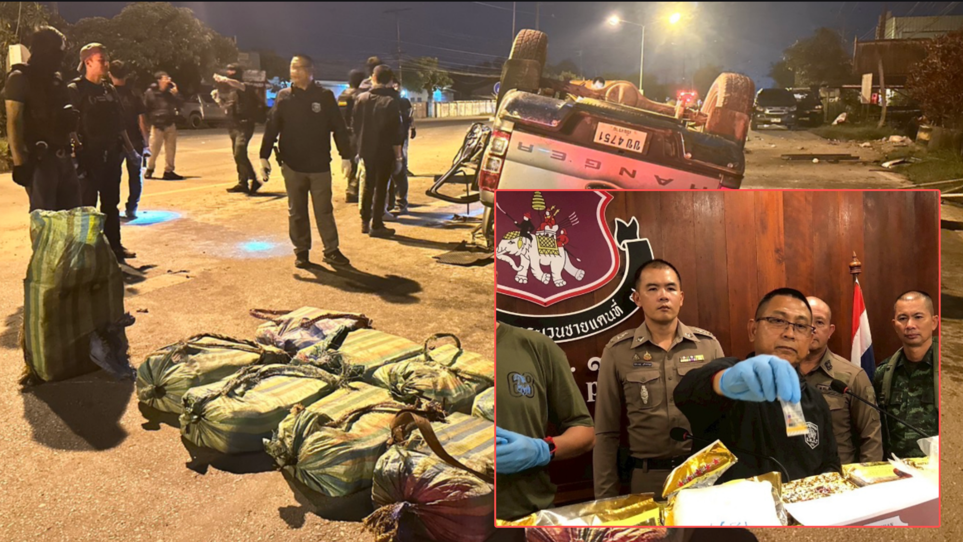 ตชด.เชียงรายสกัดจับระทึกรถกระบะขนไอซ์200 กก.ที่แม่จัน คนร้ายยิงเปิดทางหนีก่อน1ในนั้นโดดลงจากรถบาดเจ็บถูกรวบตัวส่งรพ. ส่วนคนร้ายที่อยู่ในรถหนีไปเสียหลักชนป้ายรร.พลิกคว่ำ แต่คนในรถหนีรอดไปได้ เร่งขยายผลล่า