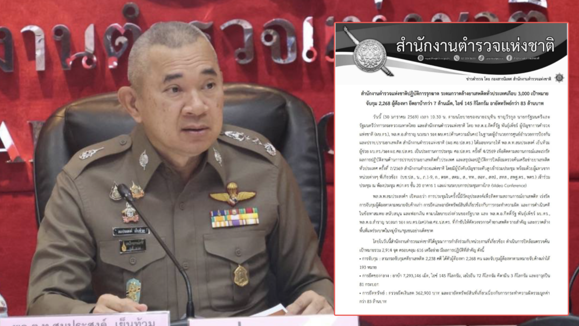สำนักงานตำรวจแห่งชาติปฏิบัติการรุกฆาต ระดมกวาดล้างยาเสพติดทั่วประเทศเกือบ 3,000 เป้าหมาย ตามนโยบายเดือนละ2ครัังจับกุม 2,268 ผู้ต้องหา ยึดยาบ้ากว่า 7 ล้านเม็ด, ไอซ์ 145 กิโลกรัม อายัดทรัพย์กว่า 83 ล้านบาท