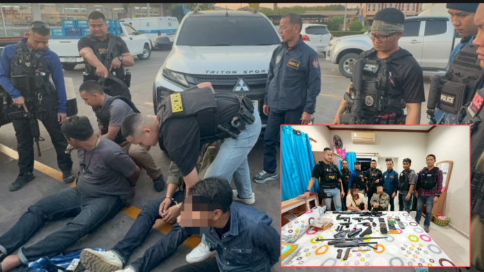 จับกุมนายธวัชชัย อายุ 35 ปี นายธนภัทร  อายุ 41 ปี และ นายอภิสิทธิ์ อายุ 26 ปี พร้อมของกลาง อาวุธปืน 8 กระบอก กระสุนชนิดต่างๆรวม 153 นัด