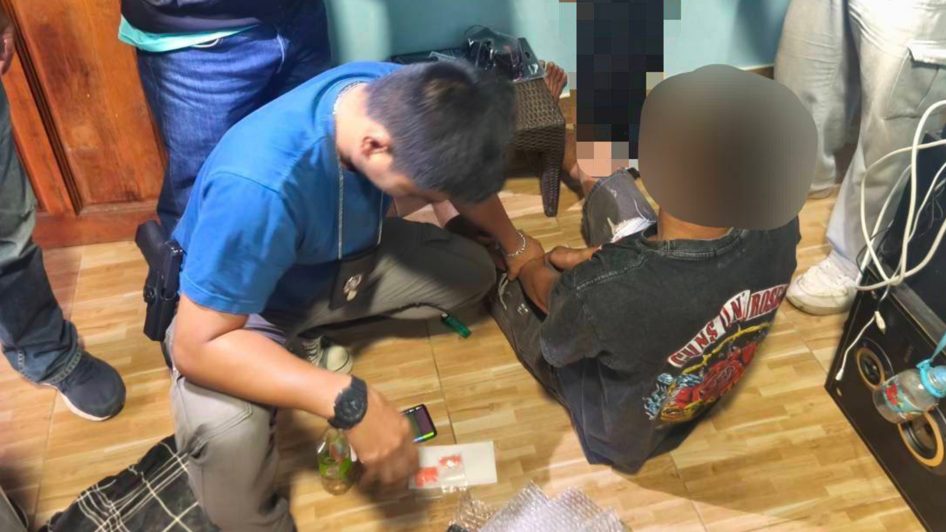 ภายในห้องพบชิ้นส่วนหม้อแปลงไฟฟ้า ลูกถ้วย และสายไฟจำนวนมาก กองรวมอยู่ พร้อมอุปกรณ์เครื่องมือช่าง เช่น หินเจีย สว่าน เลื่อยตัดเหล็ก และไขควงใช้ในการก่อเหตุ นอกจากนี้ ภายในห้องพักยังพบยาบ้า 77 เม็ด พร้อมอุปกรณ์การเสพ