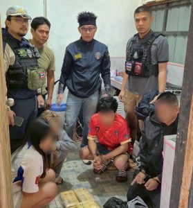 จับกุมผู้ต้องหาเครือข่ายค้ายาเสพติด 4 ราย ประกอบด้วย คือนายบุญชนะ หรือเอ็กซ์ อายุ 47 ปี (ผู้ถูกจับที่ 1) น.ส.รัตนาภรณ์ หรือจอย อายุ 47 ปี (ผู้ถูกจับที่ 2) นางสาวชมพูนุช หรือนุ่น อายุ 33 ปี (ผู้ถูกจับที่ 3) นายสันติสุข หรืออุ้ม อายุ 20 ปี (ผู้ถูกจับที่ 4)