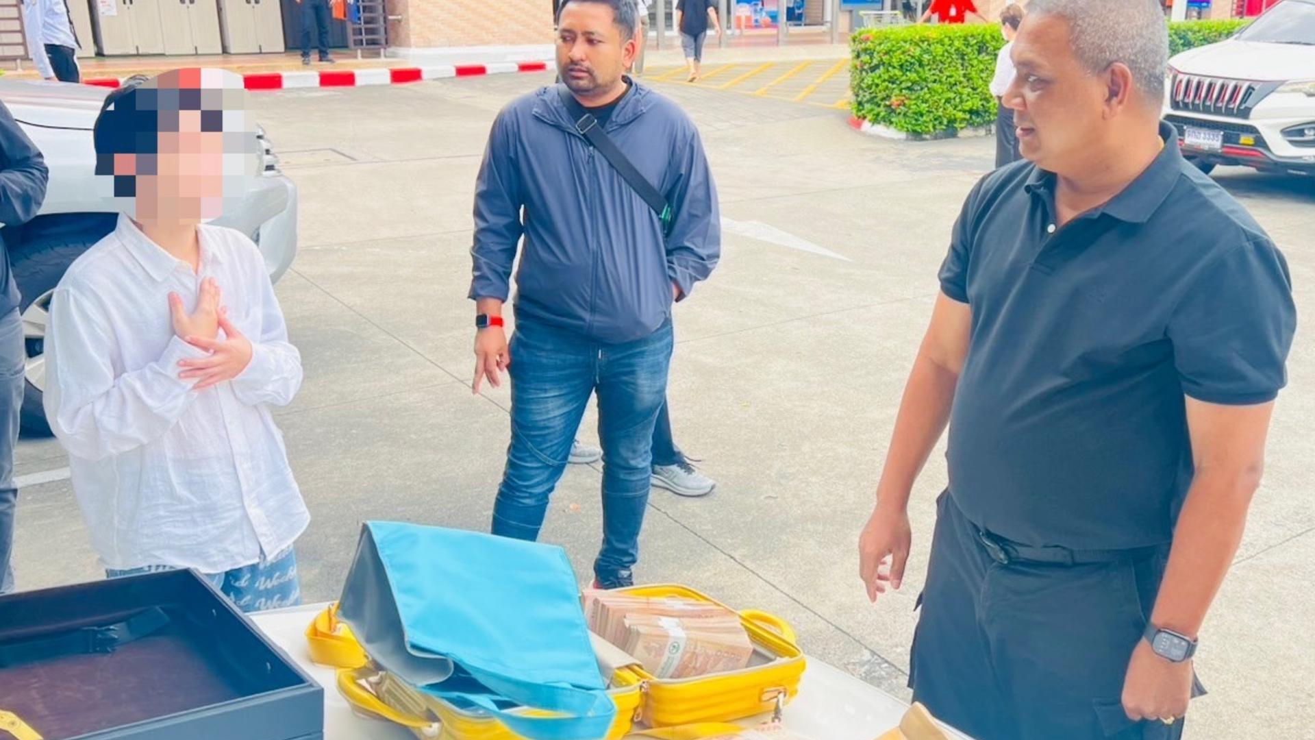 พบ  ธนบัตรรัฐบาลไทย  906 ฉบับ รวมเป็นเงิน 960,000 บาท  อยู่ในถุงผ้าสีฟ้าวางอยู่เบาะหลังคนขับ ของรถคันดังกล่าว