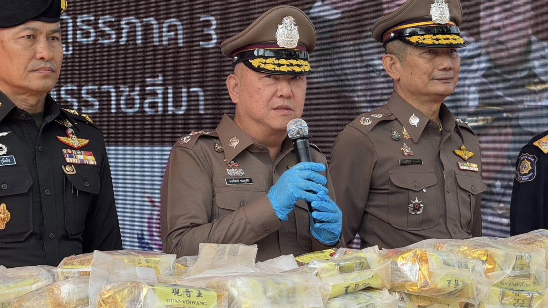 พล.ต.ท.พฤทธิพงษ์ ประยูรศิริ ผบช.ภ.3 พล.ต.ต.ณรงค์ศักดิ์ พรหมทา ผบก.ภ.จว.นครราชสีมา และชุดจับกุม ร่วมกันแถลงผลการปฏิบัติการสกัดกั้นและปราบปรามยาเสพติด ตามนโยบายรัฐบาลในการทำลายเครือข่ายยาเสพติด