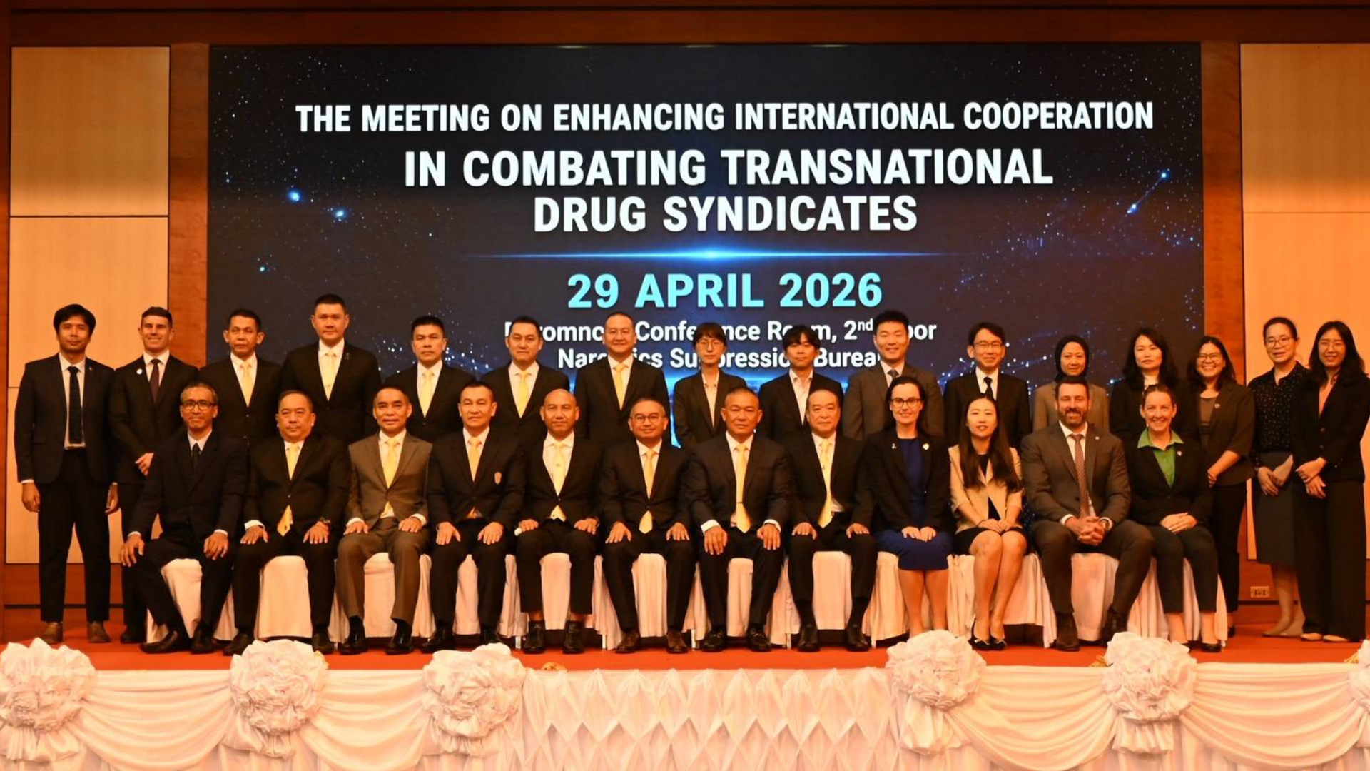 วันนี้ 29 เมษายน 2569 เวลา 09.30 น. พล.ต.ท.อาชยน ไกรทอง ผบช.ปส., พล.ต.ต.สมบูรณ์ เทียนขาว รอง ผบช.ปส., พล.ต.ต.พรศักดิ์ สุรสิทธิ์ รอง ผบช.ปส., พล.ต.ต.ธนรัชน์ สอนกล้า รอง ผบช.ปส. และ พล.ต.ต.วรพจน์ ดิษยบุตร รอง ผบช.ปส. และผู้บังคับการในสังกัด บช.ปส. จัดเวทีการประชุมความร่วมมือ “The Meeting on Enhancing International Cooperation in Combating Transnational Drug Syndicates”