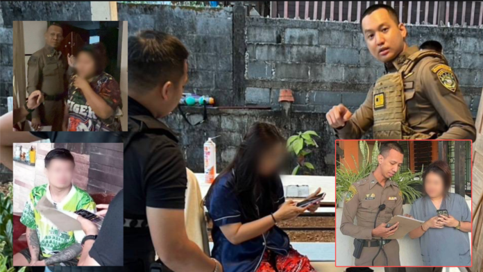 นำกำลังจับกุม น.ส.ปิยมณฑ์ อายุ 39 ปี, และ น.ส.สายชล อายุ 49 ปี น.ส.สุกัญญา อายุ 33 ปี, นายวรกรต อายุ 37 ปี และ น.ส.ศศิภา อายุ 30 ปี
