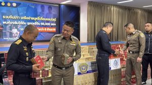 ร่วมกันแถลงผลปฏิบัติ รวบจีนเทา เครือข่ายจำหน่ายบุหรี่เถื่อนออนไลน์รายใหญ่ ตรวจพบห้องลับใต้ดินย่านรัชดาภิเษก เก็บบุหรี่จีนเถื่อน 65,000 ซอง มูลค่ากว่า 6 ล้านบาท