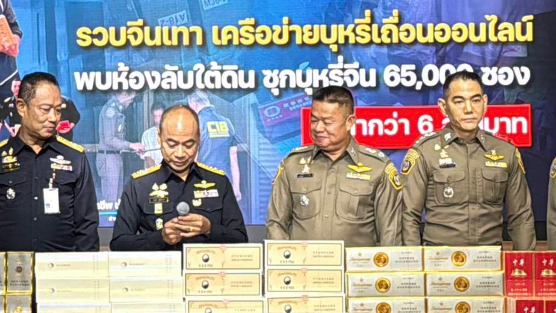 ร่วมกันแถลงผลปฏิบัติ รวบจีนเทา เครือข่ายจำหน่ายบุหรี่เถื่อนออนไลน์รายใหญ่ ตรวจพบห้องลับใต้ดินย่านรัชดาภิเษก เก็บบุหรี่จีนเถื่อน 65,000 ซอง มูลค่ากว่า 6 ล้านบาท