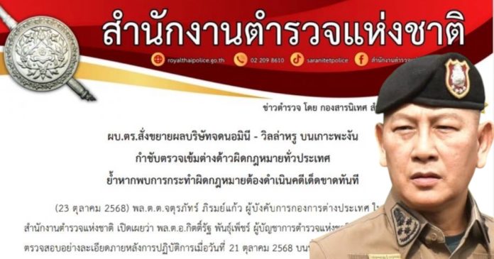 ผบ.ตร.สั่งขยายผลบริษัทจดนอมินี – วิลล่าหรู บนเกาะพะงัน กำชับตรวจเข้มต่างด้าวผิดกฎหมายทั่วประเทศ ย้ำหากพบการกระทำผิดกฎหมายต้องดำเนินคดีเด็ดขาดทันที