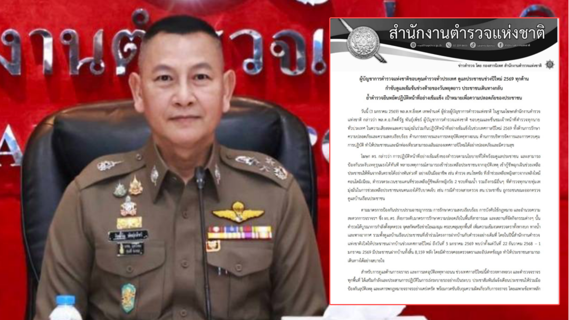 ผบ.ตร.ขอบคุณตำรวจทั่วประเทศ ดูแลประชาชนช่วงปีใหม่ 2569 ทุกด้าน กำชับดูแลเข้มข้นช่วงท้ายของวันหยุดยาว ประชาชนเดินทางกลับ ย้ำตำรวจยืนหยัดปฏิบัติหน้าที่อย่างเข้มแข็ง เป้าหมายเพื่อความปลอดภัยของประชาชน