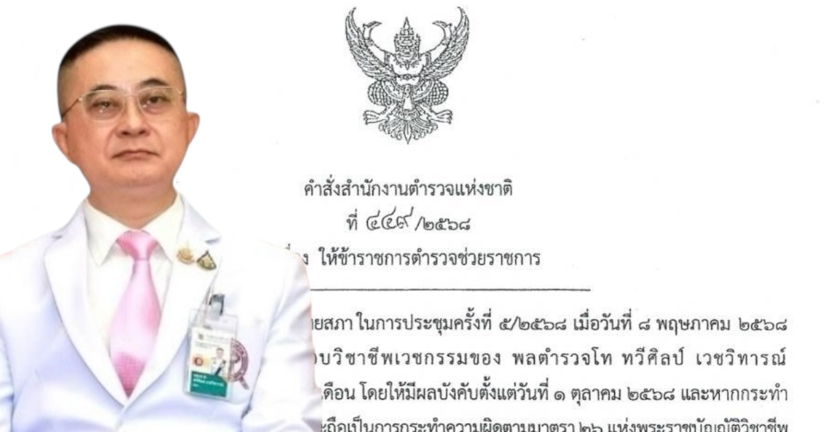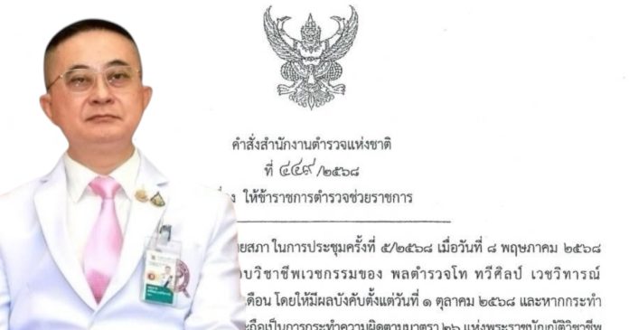 ด้วย คณะกรรมการแพทยสภา ในการประชุมครั้งที่ 5/2568 เมื่อวันที่ 8 พฤษภาคม 2568 มีมติลงโทษพักใช้ใบอนุญาตประกอบวิชาชีพเวชกรรมของ พลตำรวจโท ทวีศิลป์ เวชวิทารณ์ นายแพทย์ใหญ่ (สบ8) เป็นระยะเวลา 6 เดือน โดยให้มีผลบังคับตั้งแต่วันที่ 1 ตุลาคม 2568