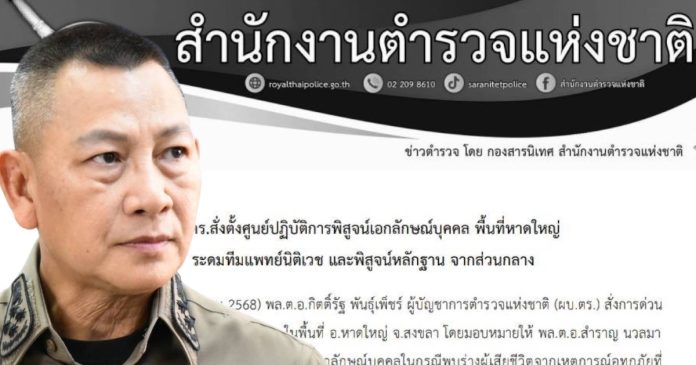 วันที่ 27 พฤศจิกายน 2568 พล.ต.อ.กิตติ์รัฐ พันธุ์เพ็ชร์ ผู้บัญชาการตำรวจแห่งชาติ (ผบ.ตร.) สั่งการด่วนตั้งศูนย์ปฏิบัติการพิสูจน์เอกลักษณ์บุคคล ในพื้นที่ อ.หาดใหญ่ จ.สงขลา