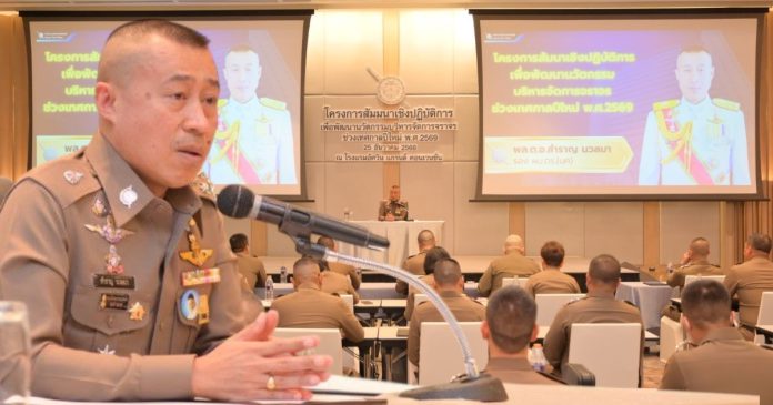 พล.ต.อ.สำราญ นวลมา รอง ผบ.ตร.เป็นประธานในพิธีเปิดโครงการสัมมนาเชิงปฏิบัติการ “การพัฒนานวัตกรรมบริหารจัดการจราจรช่วงเทศกาลปีใหม่ พ.ศ. 2569” พร้อมมอบนโยบายการบริหารงานด้านความมั่นคงและการจราจรแก่ผู้บริหารและเจ้าหน้าที่ที่เกี่ยวข้อง
