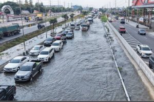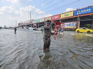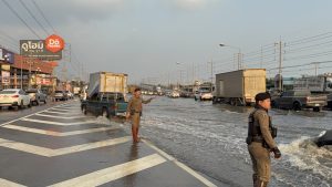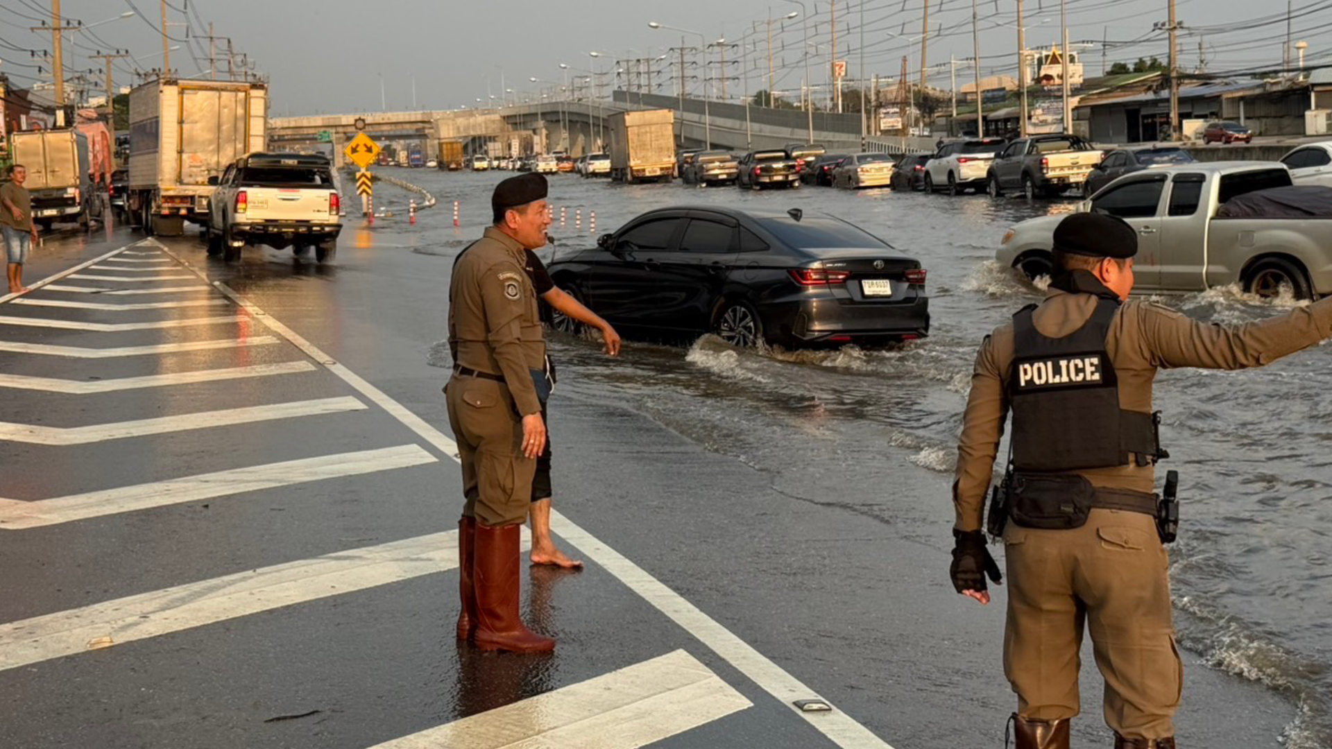 ปริมาณรถมาก ตอนนี้ระดับน้ำได้เริ่มลดลงมานิดหนึ่งแล้วสามารถให้รถเล็กวิ่งช่องทางขวาได้รถใหญ่ให้วิ่งช่องทางกลางและเลนซ้ายสุด รถเล็กใช้ช่องทางขวาสุด