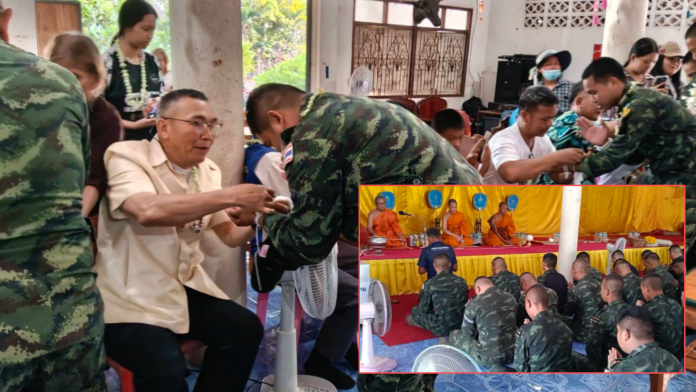 ชาวบ้านร่วมพิธีผูกข้อมือรับขวัญ “นักรบชายแดน” เสริมสิริมงคลและอุทิศส่วนกุศลให้วีรบุรุษผู้ล่วงลับจากศึกเขมร ที่ วัดโนนหมากมุ่น