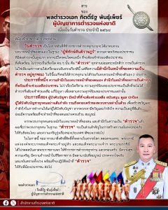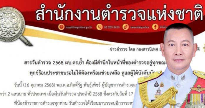 วันที่ 16 ตุลาคม 2568 พล.ต.อ.กิตติ์รัฐ พันธุ์เพ็ชร์ ผู้บัญชาการตำรวจแห่งชาติ มีสารถึงข้าราชการตำรวจกว่า 2 แสนนาย ทั่วประเทศ เนื่องในวันตำรวจ ประจำปี 2568 ซึ่งตรงกับวันที่ 17 ตุลาคม 2568 ดังนี้