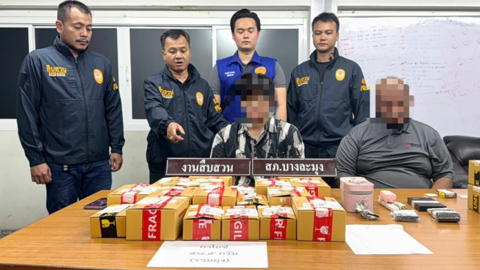จากนั้นชุดสืบสวนบางละมุงลงพื้นที่ตรวจสอบตรวจยึดพัสดุจำนวนดังกล่าว พร้อมสืบสวนนทราบว่า ผู้ที่นำยาเสพติดมาส่งให้กับทางร้าน คือ นายณัฐวัธน์หรือณัฐ  อายุ 36 ปี อาชีพไรเดอร์ ก่อนจับกุมได้ที่บ้านพัก พร้อมของกลางเพิ่มเป็นยาไอซ์อีกจำนวนหนึ่ง กล่องพัสดุ ฟอยล์สำหรับห่อหุ้ม และอุปกรณ์ที่เหลือ