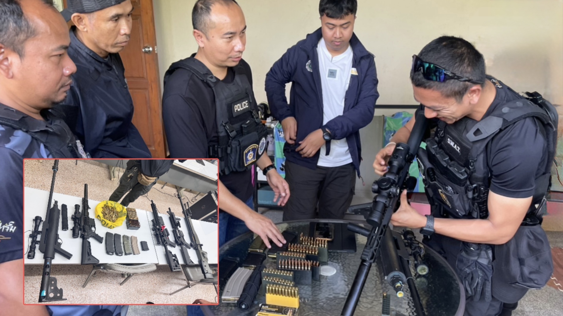 ยึดของกลางปืนสงคราม M4 ขนาด 5.56 ไม่มึทะเบียน 1 กระบอก ปืนอัดลมลำกล้อง .22 ไม่มีทะเบียน 1 กระบอก ปืน BB GUNดัดแปลง 2 กระบอก กระสุนปืน 5.56 อีก 290 นัด