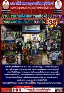 ร่วมกันออกตรวจป้องกันเหตุอาชญากรรมและกวดขันรถจักรยานยนต์แข่งรถในทาง / ก่อความเดือดร้อนรำคาญ บริเวณถนนสาธารณะเส้นทางรอบเมือง ในพื้นที่รับผิดชอบ พร้อมเปิดไฟวับวาบ ตามพื้นที่จุดเสี่ยง บริเวณโครงการชลประทาน ,แยกกระสัง-แยกภัทร, สนามช้างอารีน่า,คลองละลม เส้นทางหลักในพื้นที่เสี่ยง.