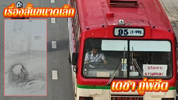 เวลาคล้อยผ่านไปหลายนาทีจนกระทั่งรถเมล์สายที่รอเข้ามาจอดหน้าป้าย รอจนคนลงจากรถแล้วข้าพเจ้าก้าวขึ้นรถเมล์ตามหญิงสูงวัย ที่คิดว่านางจะนั่งสายอื่น