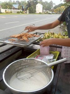 เมื่อนำกล้วยที่ได้มาล้างทำความสะอาดเปลือกอย่างดีแล้ว จะหั่นให้ได้ชิ้นหนาปานกลาง จากนั้นนำมาชุบกับแป้งซึ่งได้คลุกเคล้าส่วนผสมที่หลากหลาย อาทิ น้ำตาล, น้ำเปล่า, น้ำปูนใส, หัวกะทิ, เกลือป่น, แป้งทอดกรอบ และงาขาว ใช้เครื่องตวงวัด
