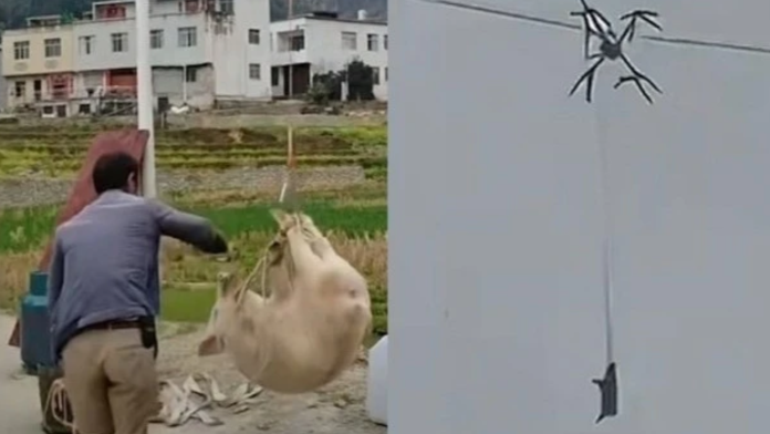 แค่ความพยายามนำส่งหมูเข้าโรงฆ่าสัตว์ครั้งแรก ก็สร้างปัญหา “โดรนบรรทุกหมุ” บินลอยเกี่ยวสายไฟฟ้าแรงสูง ติดค้างห้อยต่องแต่ง