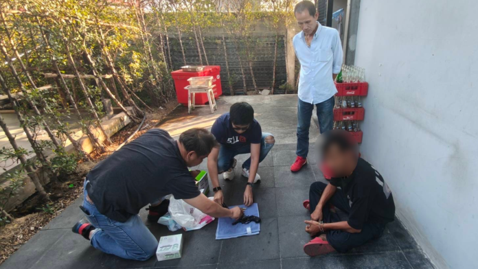 เมื่อถึงเวลานัดหมาย เจ้าหน้าที่ที่ซุ่มสังเกตการณ์พบชายมีลักษณะตรงตามที่สายลับแจ้ง นั่งอยู่หน้าห้องน้ำของปั๊ม โดยมีกล่องวางข้างตัว ท่าทางมีพิรุธ จึงเข้าแสดงตัวขอตรวจค้น