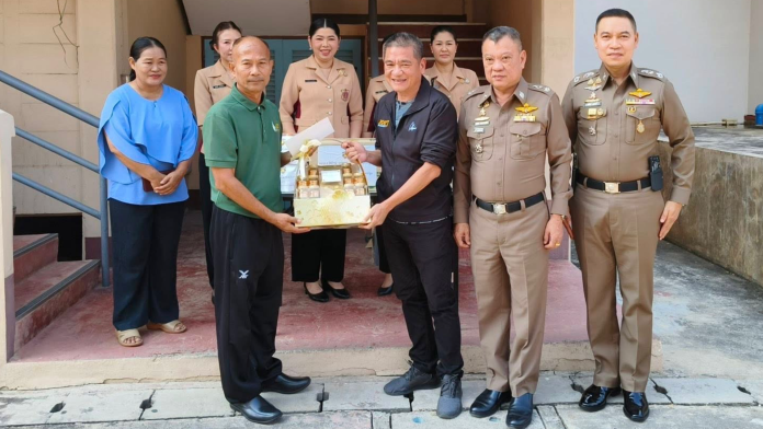 พร้อมมอบสิ่งของเครื่องอุปโภคบริโภค และเงินช่วยเหลือจากกองสวัสดิการข้าราชการตำรวจ สำนักงานตำรวจแห่งชาติรายละจำนวน 5,000 บาท และเงินช่วยเหลือจากสมาคมแม่บ้านตำรวจอีกจำนวน 5,000 บาทรวม 10,000 บาท เพื่อเป็นขวัญและกำลังใจของข้าราชการตำรวจและครอบครัวตามโครงการ จำนวน 4 นาย